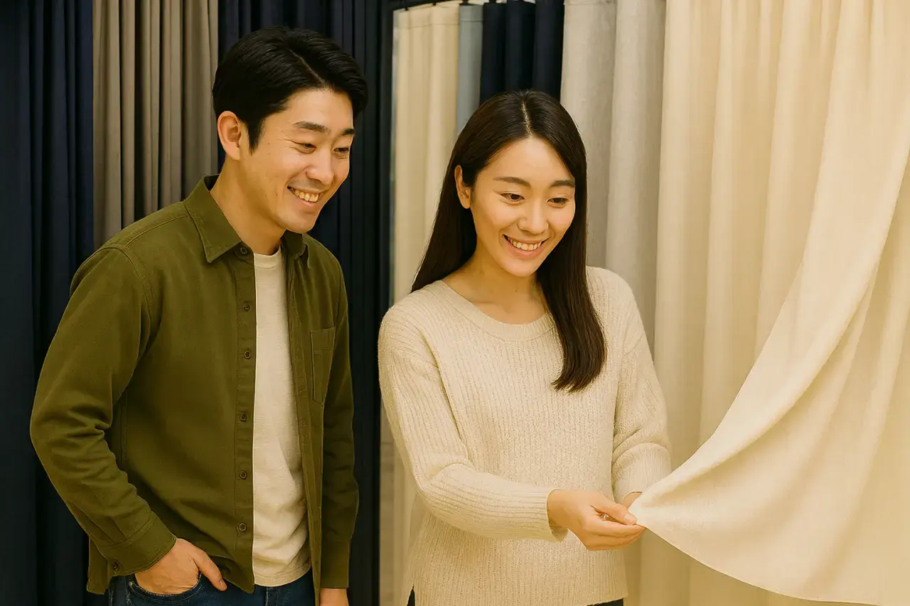 当店はオーダーカーテンを中心に、インテリア雑貨やラグ、照明など暮らしを彩るアイテムを取り揃えています。専門スタッフがお客様のライフスタイルやご要望を伺い、最適な空間づくりをご提案いたします。